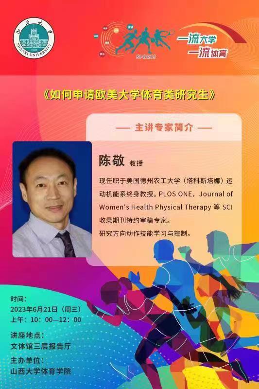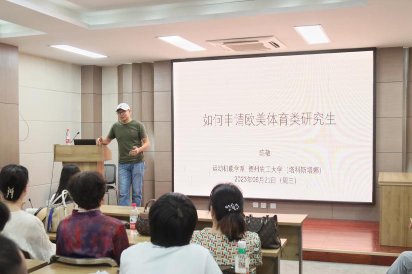夏至时节,万物芳华。为了拓宽广大师生的国际视野,营造浓厚的学术氛围,助力一流体育团队建设,EMC易倍特邀95级优秀员工、美国德州农工大学(塔科斯塔娜)运动机能系陈敬教授(终身教授)于2023年6月21日上午10:00-12:00在文体馆三楼会议室作了题为“如何申请欧美体育类研究生”的分享,本次交流活动由EMC易倍副经理孟林盛主持,EMC易倍经理石岩教授和部分师生参加了本次学术交流活动。